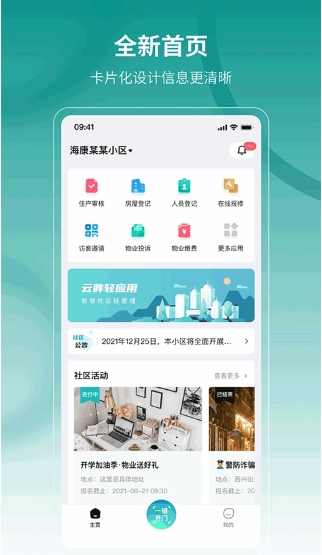 2、为住户提供访客预约、一键开门等快捷功能,以及社区公告、问题反馈、物业论坛等社区信息服务。