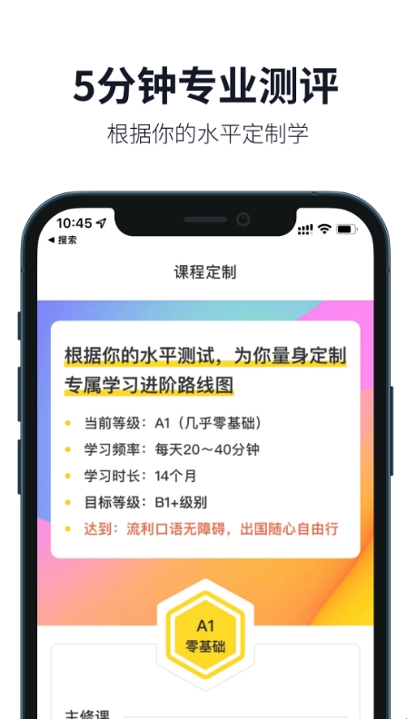 1、用户进入APP会首先进行5分钟英语等级测评,根据水平定制学习计划,零基础也不用担心学不会。