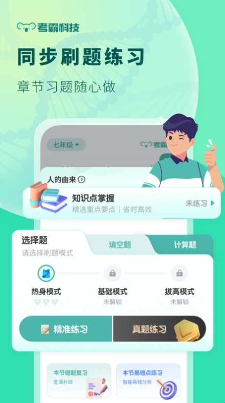 考霸科技智能题库,老师们的优质选择,孩子们复习巩固的品质保障;题库智能总结章节重点,考试难点,历年常考等几大类题型,更结合闯关模式,游戏式做题让孩子爱上学习,爱上刷题~