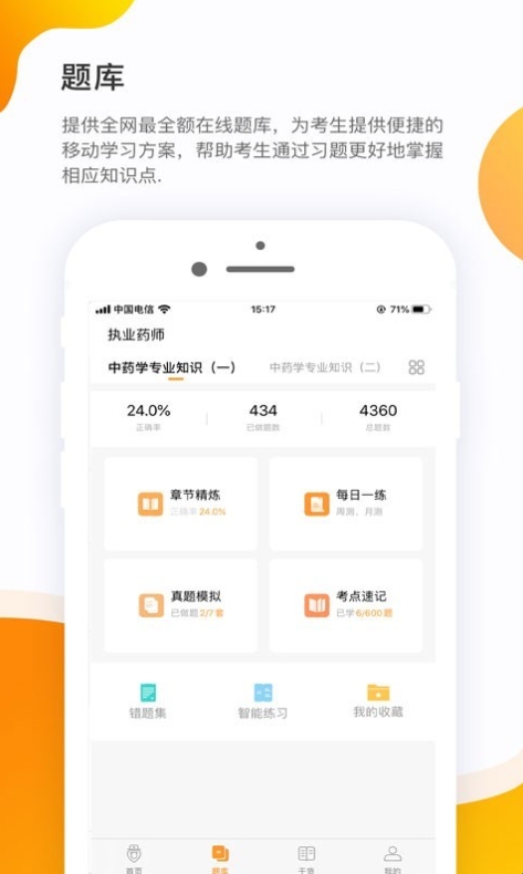 题库支持不同的组卷模式:章节精炼、每日一练、历年真题、考点速记、智能练习,药考生刷题必备!