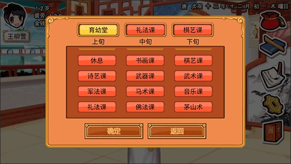 以下可以简单教教大家怎样快速增加属性值和声望值。先是育幼堂,一直干到魅力和亲和力达到标准。接着是礼法课,一直上到气质和礼仪达到标准。然后是棋艺课,一直到自信达到标准。