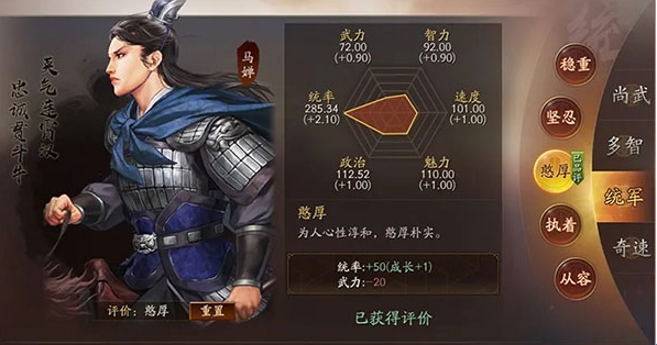 在拜师后,可为武将选择评价。评价会改变武将的基础属性成长,且只能选择一种评价。