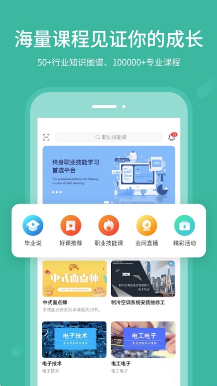 1、打开app,新用户需要注册账号,登录进入【首页】,你会看到上方有毕业说、业问好课、职业技能课等,选择你要观看的视频。