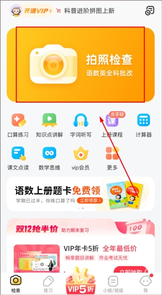 1、进入app首页之后,对着习题册点击“拍照检查”按钮,就会自动识别练习册中的算术题。