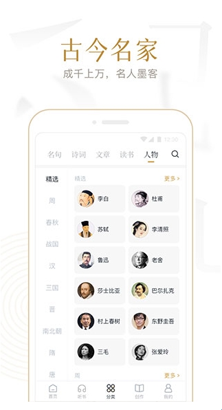 作者精选:可通过作者分类的精选了解到各朝代文学大家的经典作品。从古至今包括:孔子、屈原、司马迁、陶渊明、李白、杜甫、苏轼、鲁迅、老舍、莎士比亚、巴尔扎克……近万