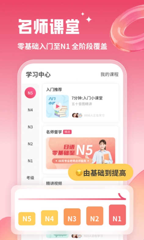 3.特建日语学习课堂,聘请多位日语教学名师制作日语课程。课程嵌入软件学习体系,让你能够随时随地的跟着名师学日语。