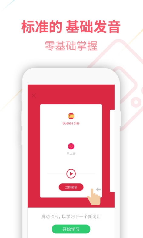 4.每个学习词语都标有标准西班牙语音频教学,标有对应的普通话与罗马音翻译。