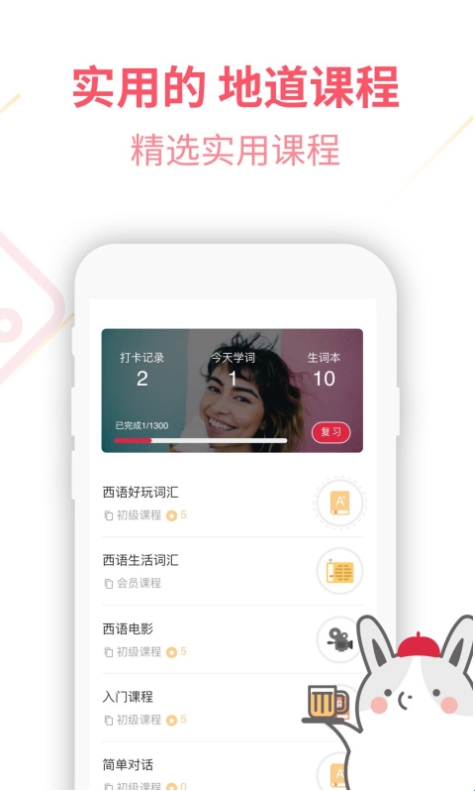 2.精选西班牙语必备50词,进阶至西班牙语初级基础词汇三部曲,更有看电影学西班牙语等各类场景专题课程。