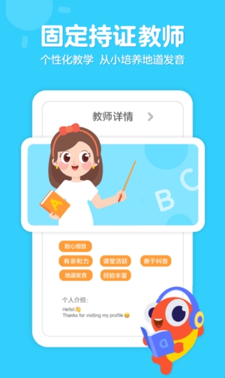 伴鱼严格甄选的欧美外教,不仅具有丰富的少儿英语教学经验,更有极佳的亲和力,善于引导并与孩子交流。原汁原味的纯正口语,更能培养孩子的语感。