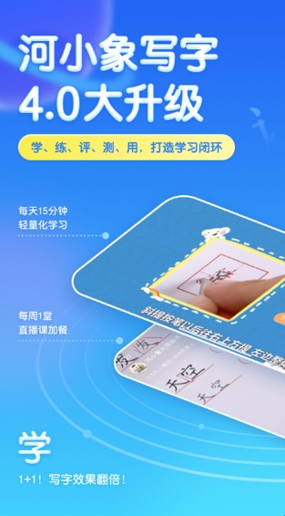 河小象少儿写字课app是一款专为学生提供的练字学习软件,软件将传统的纸笔显字搬到线上来练习,培养孩子们的书法绘画兴趣,并且会有专业的老师在线给孩子们提供一对一的辅导服务,并且会做点评,拥有楷书,行书,行楷,艺术早熟等字体,学生可以自行选择练习,有兴趣的用户快来下载吧!